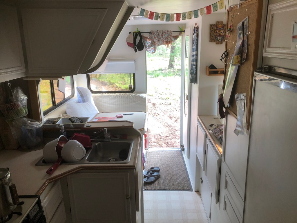 Right away we went to work customizing it. Mike added solar panels, solar controller, inverter and batteries. The camper was ready for boondocking. Then we updated the interior look with some paint, slipcovers and window treatments.