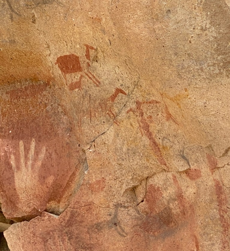 This is not a small collection. There are estimated to be over 2,000 handprints in this area, some are repeated several times. Some show evidence of missing or curled fingers. The vast majority are left hands, indicated the artist was right-handed. There is at least one that has five fingers and a thumb visible. But there are other things represented in the rock art along this cliff face.