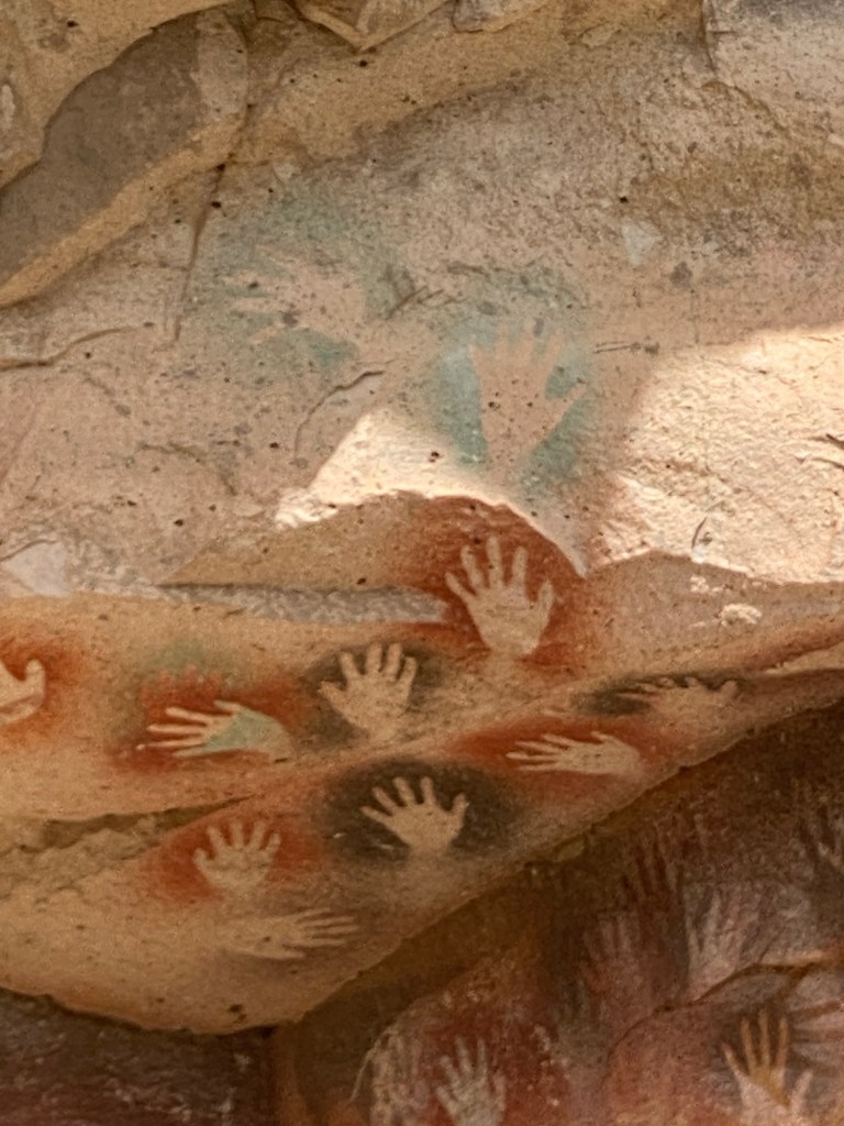 It is not actually a cave, but rather an overhanging, rock shelf. The trail begins with a collection of hand imprints. These were made by placing the hand on the wall and blowing mineral pigments through a hollow reed or animal bone. This left a negative imprint of the hand on the wall (and no doubt a stained hand).