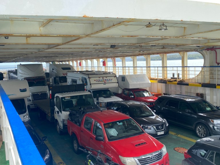 Then it was time to get in line for the ferry. We are leaving mainland Chile and going to the islands of Chiloe. This ferry ride is part of the Chilean highway system and crosses a large inlet of the South Pacific Ocean between mainland and Quellon, Chiloe, Chile. Join us for a ferry ride to some island time!