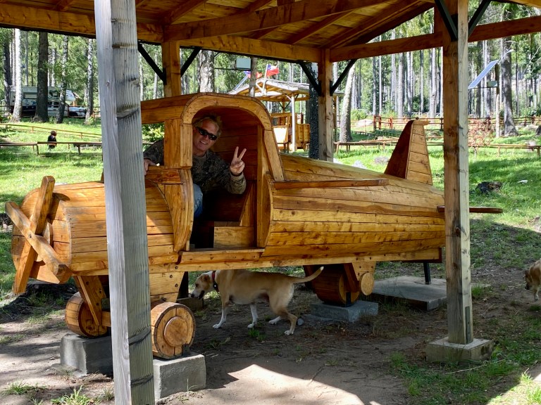 We paused in a small town for groceries and ate sandwiches in the park. It was a cute park, filled with handmade, wooden structures to climb and play on. We had fun with the dogs exploring the airplane and boat.